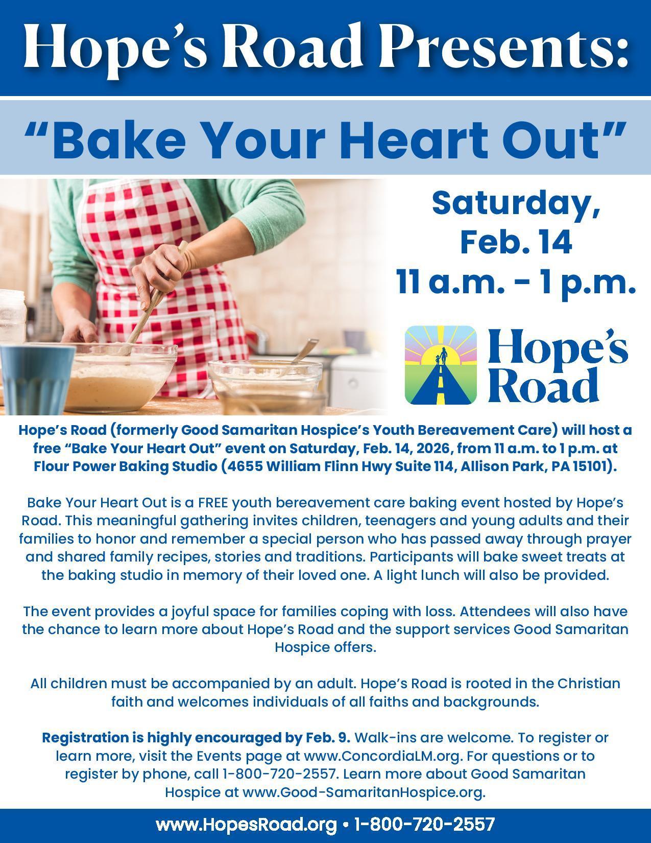 Hope’s Road: Bake Your Heart Out, taking place on Saturday, February 14, from 11:00 a.m.–1:00 p.m. at Flour Power Cooking Studio in Allison Park, PA.
