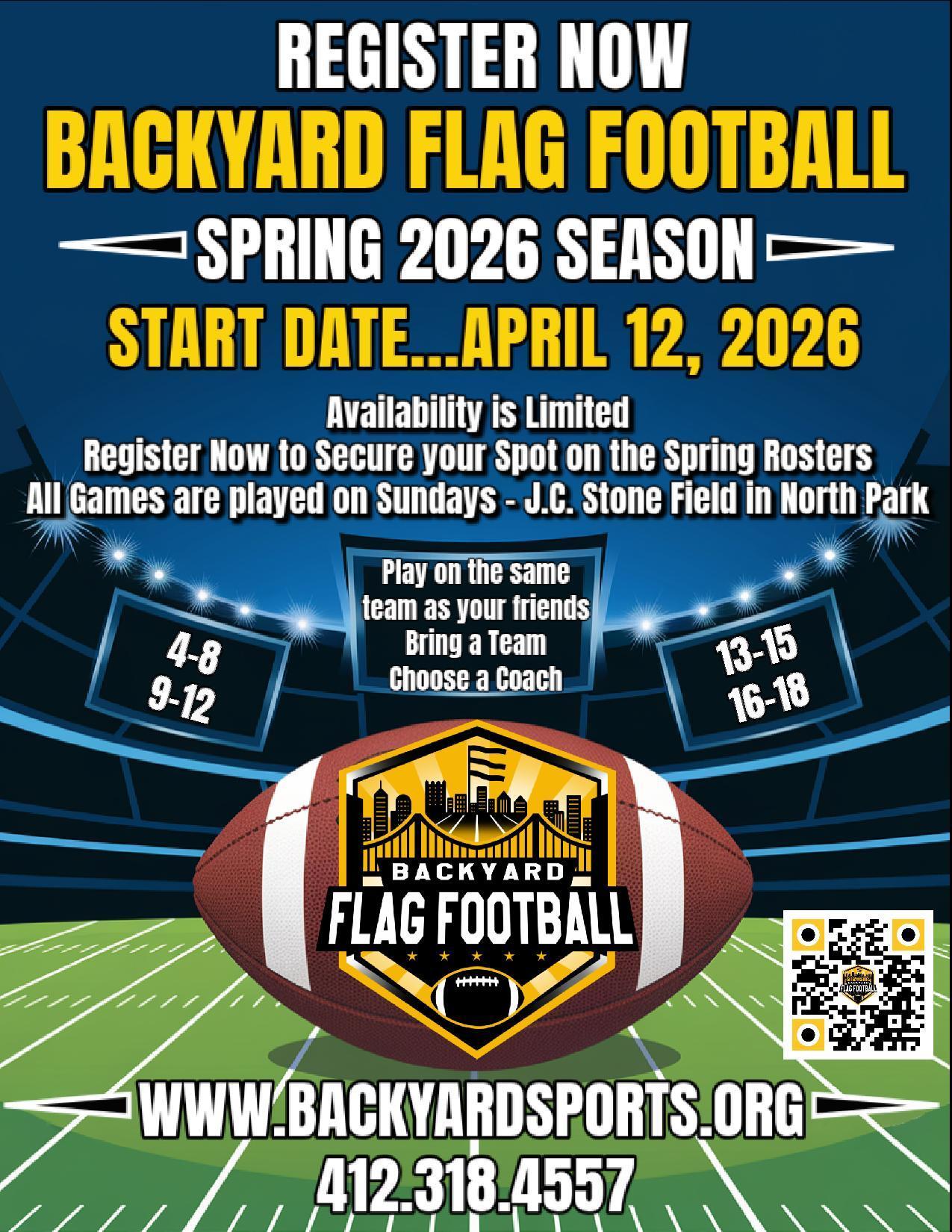 Backyard Sports is offering flag football for students ages 4 - 18. Games are played on Sundays at J.C. Stone Field in North Park. Games start April 12th. Sign up at www.backyardsports.org.