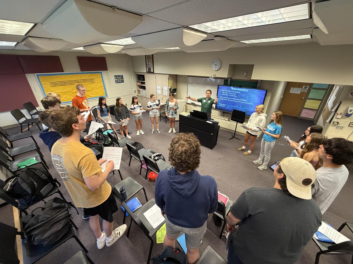 The high school Women’s Ensemble and Chamber Singers classes recently hosted Dr. Christopher Scott, the Music Department Chair and Professor of Vocal Studies at Slippery Rock University. Dr. Scott presented a masterclass focusing on vocal technique in a choral setting and offered feedback to help improve some of the songs that will be featured at the upcoming choir concert on Tuesday, April 28.